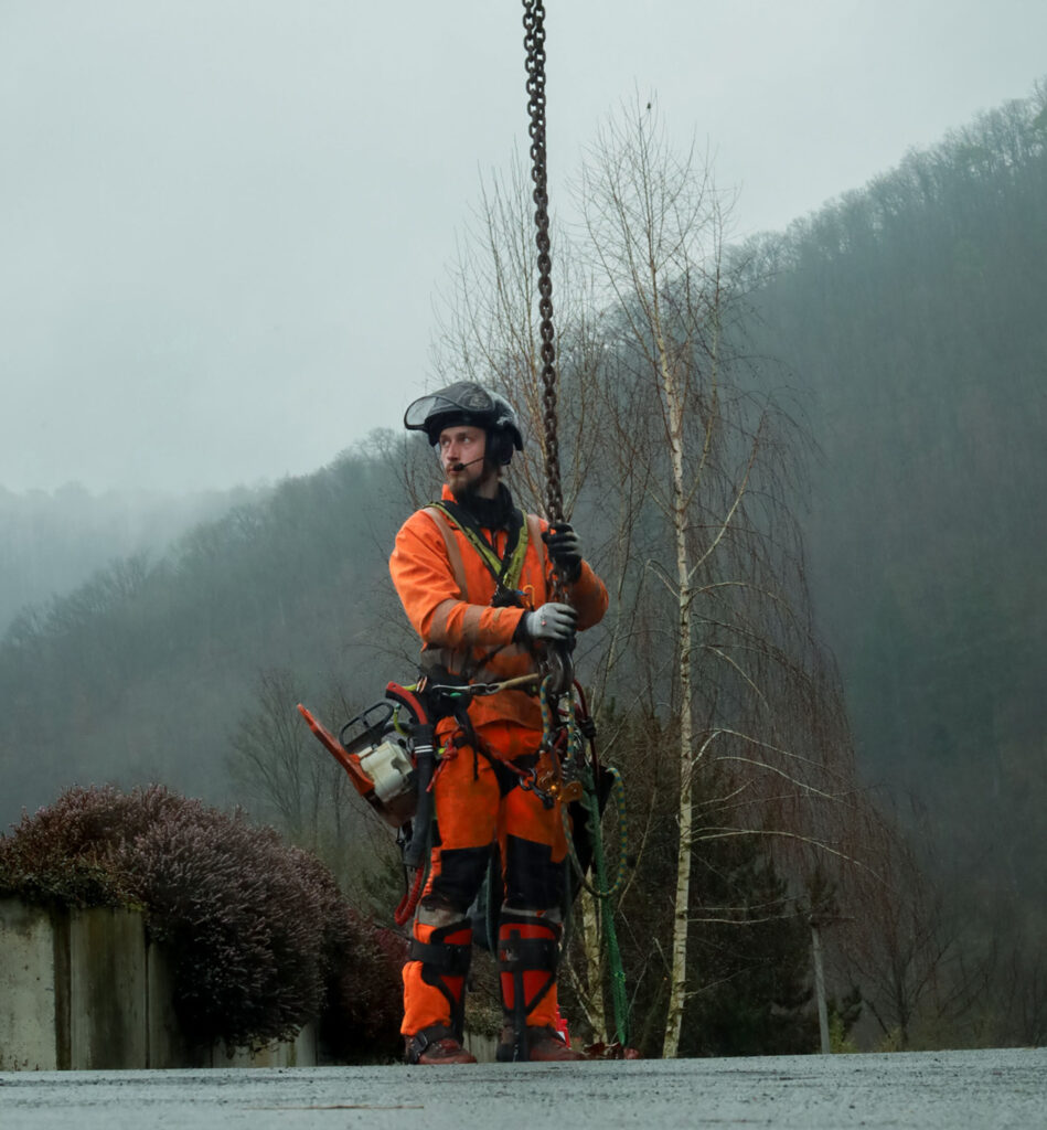Ob im freien Gelände oder in enger Bebauung – wir fällen Bäume sicher und präzise. Durch den Einsatz moderner Klettertechnik, Seilunterstützung oder Kran können wir auch Problem- und Gefahrenbäume kontrolliert entfernen.